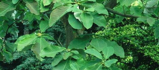 Листья большие, обратнояйцевидной формы, кожистые, до 30 - 40 см в длину. Широкие у основания и заострённые в окончании, у основания имеют зелёный цвет, а ближе к концам – сизый. Молодая листва опушённая, но с возрастом становится гладкой. Листья собраны по 9-10 штук.